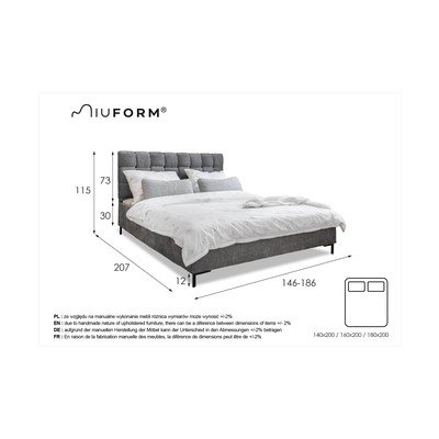 Ovaj krevet brenda Miuformimpresionira svojim pletenim uzglavljem mekim na dodir s trodimenzionalnom strukturom. Njegova konstrukcija sastoji se od čvrstog tapeciranog okvira i opružnih letvica koje pouzdano podupiru madrac. Sve to zatim nadopunjuju uske metalne noge koje podižu krevet radi lakšeg održavanja.