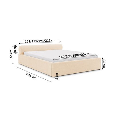 Krem tapecirani bračni krevet s prostorom za odlaganje s podnicom 180x200 cm Cille – Ropez
