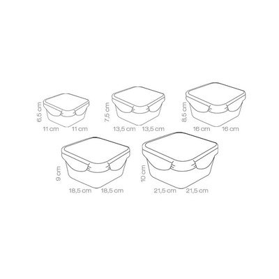 Freshbox kutije za hranu imaju hermetički i vodonepropusni poklopac sa silikonskom brtvom. Tako hrana dulje ostaje svježa i punog okusa. Osim toga, sadržaj ne curi prilikom nošenja. Bez problema podnose temperature od -18 do 110°C. Detaljne dimenzije kompleta: - 21,5 x 10 cm, - 18,5 x 9 cm, - 16 x 8,5 cm, - 13,5 x 7,5 cm, - 11 x 6,5 cm.