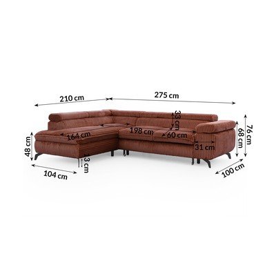 Od samtaPodesiva/sklopiva/s prostorom za odlaganjeS lijevim kutom/u obliku slova LBoja terakotePogodna za kućne ljubimce/otporna na mrljeS 4 mjestaŠirina 275 cm