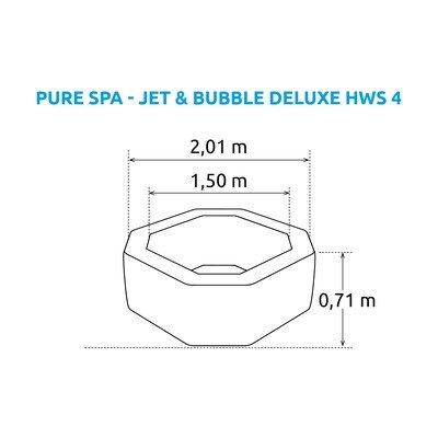 U paketu ćete naći i dva podglava, termoizolacijski poklopac, grijač, sustav za filtriranje, mlaznicu pumpe, tri filterska uloška, izolacijsku podlogu, crijevo za napuhavanje, vrećicu, mali plovak za mini tablete za bazen , tester za klor, pH i lužnatost te 5 m kabela za napajanje. Hidromasažna kada se ne može spojiti na solarni grijač, klorinator ili pješčanu filtraciju.