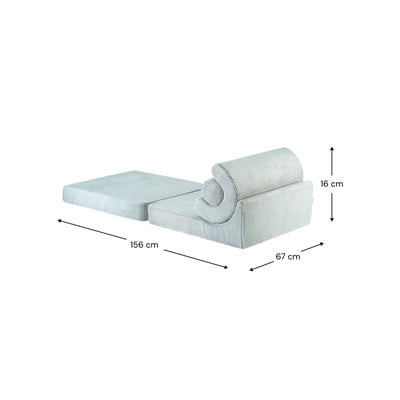 Stolica je prikladna za djecu od 5 do 11 godina. Kada je rasklopljena, dimenzije su joj 67 x 156 x 16 cm. Navlaka od korduroja se može skinuti i prati u perilici rublja na 30 °C sa sličnim bojama. Zatim je ostavite da se osuši na zraku.