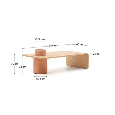 Klub stolić Olaria iz Kave Homea na originalan način spaja prirodnu ljepotu drva i terakote. Okrugli stol dimenzija 110 x 60 cm izrađen je od jasenovog furnira u prirodnoj nijansi i ima originalni otvor od terakote koji se može koristiti, na primjer, kao posuda za cvijeće.