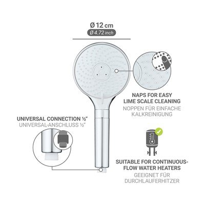 Tuš glava Water Saving tvrtke Wenko pretvara vaše svakodnevno tuširanje u ekološko iskustvo. Kombinira moderan dizajn s naprednom tehnologijom uštede vode, osiguravajući optimalnu udobnost uz značajno smanjenje potrošnje vode. Zahvaljujući integriranom regulatoru WaterSaving, brzina protoka može se postaviti na samo 9 litara u minuti, što predstavlja uštedu od najmanje 35% u usporedbi sa standardnim tuševima. Ova tuš glava od 12 cm ne samo da poboljšava izgled vaše kupaonice, već i pomaže u zaštiti okoliša štedeći vodu i energiju. Uživajte u personaliziranom iskustvu tuširanja s tri podesive funkcije koje zadovoljavaju i nježne i jake preferencije. Univerzalni priključak olakšava instalaciju i kompatibilan je s protočnim bojlerima, osiguravajući besprijekornu integraciju u svaku kupaonicu.