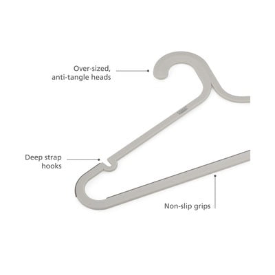 Kuke na vješalicama Orderly su ravne i velike, što ih čini lakim za stavljanje i skidanje s vješalice za odjeću. Osim toga, njihov oblik sprječava preklapanje i zapinjanje vješalica ili odjeće. Silikonske protuklizne površine na ramenima i vješalici za hlače osiguravaju stabilnost odjeće.