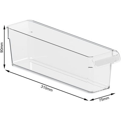 Organizator od pleksiglasa u cijeloj dubini hladnjaka. Uska dimenzija za spremanje uskih i manjih predmeta. Ali ne znam koliko je otporan na padove s ...