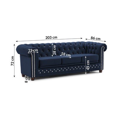Baršunasti, sklopiva, chesterfield, plava, vodootporna/otporna na mrlje, s 2 mjesta, širina 203 cm