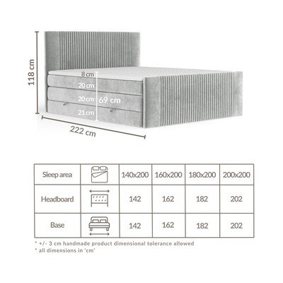 Osim udobnosti, krevet nudi i praktičan prostor za pohranu koji će vam pomoći da vaša spavaća soba bude uredna. Čvrsta konstrukcija i nosivost od 240 kg osiguravaju da je krevet izdržljiv i robustan. Krevet je opremljen bračnim madracem. Donji osnovni madrac izrađen je od bonell opruga i T-25 pjene.