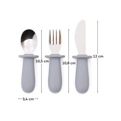 Dječji pribor za jelo Lili brenda Kave Home praktičan je set koji će mališanima olakšati objedovanje. Dizajniran je imajući na umu male goste i nije samo funkcionalan već i zabavan, što roditeljima olakšava hranjenje, a djeci jelo čini ugodnijim. Set uključuje žlicu, vilicu i nož. Sva tri dijela imaju čvrste, ergonomske silikonske drške idealne za male dječje ruke. Metalni funkcionalni dijelovi su izdržljivi, a oštrica noža je tupa i sigurna za djecu.