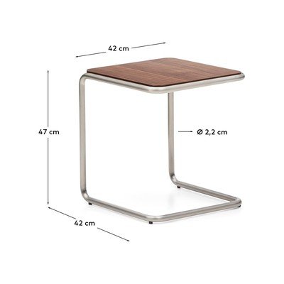 Pomoćni stolić Tarselbrenda Kave Home moderna je reinterpretacija elegancije sredine stoljeća, koja kombinira funkcionalnost s vizualnom sofisticiranošću. Njegova gornja ploča izrađena je od furnira oraha debljine 0,6 mm, što je u kontrastu s bazom od brušenog cjevastog nehrđajućeg čelika. To stolu daje moderan i profinjen izgled.