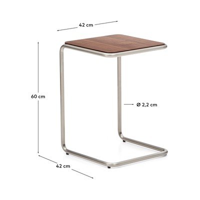 Pomoćni stolić Tarselbrenda Kave Home moderna je reinterpretacija elegancije sredine stoljeća, koja kombinira funkcionalnost s vizualnom sofisticiranošću. Njegova gornja ploča izrađena je od furnira oraha debljine 0,6 mm, što je u kontrastu s bazom od brušenog cjevastog nehrđajućeg čelika. To stolu daje moderan i profinjen izgled.