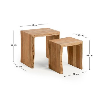 Lomiri pomoćni stolići brenda Kave Home praktičan su set od dva komada koji se lako umeću jedan u drugi. Izrađeni su od masivnog bagremovog drva, što im daje čvrstoću i prirodan izgled. Njihov dizajn ističe se prirodnom teksturom drva i blago nepravilnim rubovima, koji svakom komadu daju originalan karakter.