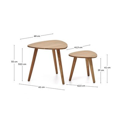 Duvani bočni stolići brenda Kave Home praktičan su set od dva komada koji se lako umeću jedan u drugi. Izrađeni su od masivnog bagremovog drva. Njihove ploče imaju organski trokutasti oblik sa zaobljenim rubovima i podupiru ih tri kose noge. Njihov dizajn kombinira ugodan izgled i praktičnost, što ih čini izvrsnim izborom za suvremene interijere.
