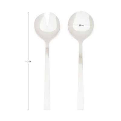 Pribor za salatu Nirela brenda Kave Home praktičan je dodatak svakoj kuhinji. Set od dva pribora za jelo od nehrđajućeg čelika, jedan u obliku šupljikave žlice, a drugi u obliku pune žlice, dizajniran je za jednostavno posluživanje salata. Izrađen je od nehrđajućeg čelika, što osigurava besprijekoran izgled i jednostavno održavanje nakon svake upotrebe. Materijal karakterizira visoka otpornost na koroziju i dugi vijek trajanja. Zahvaljujući funkcionalnom i svestranom dizajnu, idealan je izbor za svakodnevno objedovanje, kao i za posebne prigode, donoseći praktičnost i eleganciju u vašu kuhinju.