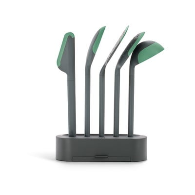 Lékué set kuhinjskog pribora sadrži 5 osnovnih dijelova koje će svaki kuhar cijeniti. Set uključuje žlicu za posluživanje, okretač, kutlaču, hvataljke i kutlaču. Također uključuje praktični stalak, zahvaljujući kojem ćete uvijek imati pribor pri ruci. Pribor je otporan na visoke temperature i neće ogrebati površinu posuđa. Izrađen je od silikona, koji može izdržati temperature do 220 °C, i PBT-a, koji je čvrst i higijenski materijal otporan na temperature do 180 °C. Dimenzije: žlica za posluživanje 7,2 x 4,7 x 29 cm okretač 9,5 x 7 x 30,6 cm kutlača 9,5 x 7 x 28,5 cm hvataljke 6,2 x 5,1 x 28,4 cm kutlača 8,8 x 8,4 x 26,2 cm