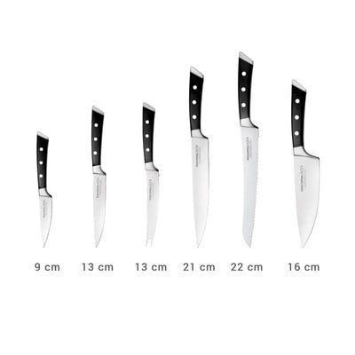 Azza noževi kovani su od japanskog nehrđajućeg čelika, što daje oštrici izdržljivost i oštrinu. Ergonomski oblikovana ručka s čvrstim zakovicama osigurava udobno rukovanje. Cijeli set je upotpunjen blokom za sigurno i praktično skladištenje. Detaljan sadržaj seta: - univerzalni nož: duljina 9 cm, - pomoćni nož: duljina 13 cm, - nož za povrće: duljina 13 cm, - kuhinjski nož: duljina 16 cm, - nož za rezbarenje: duljina 21 cm, - nož za kruh: duljina 22 cm.