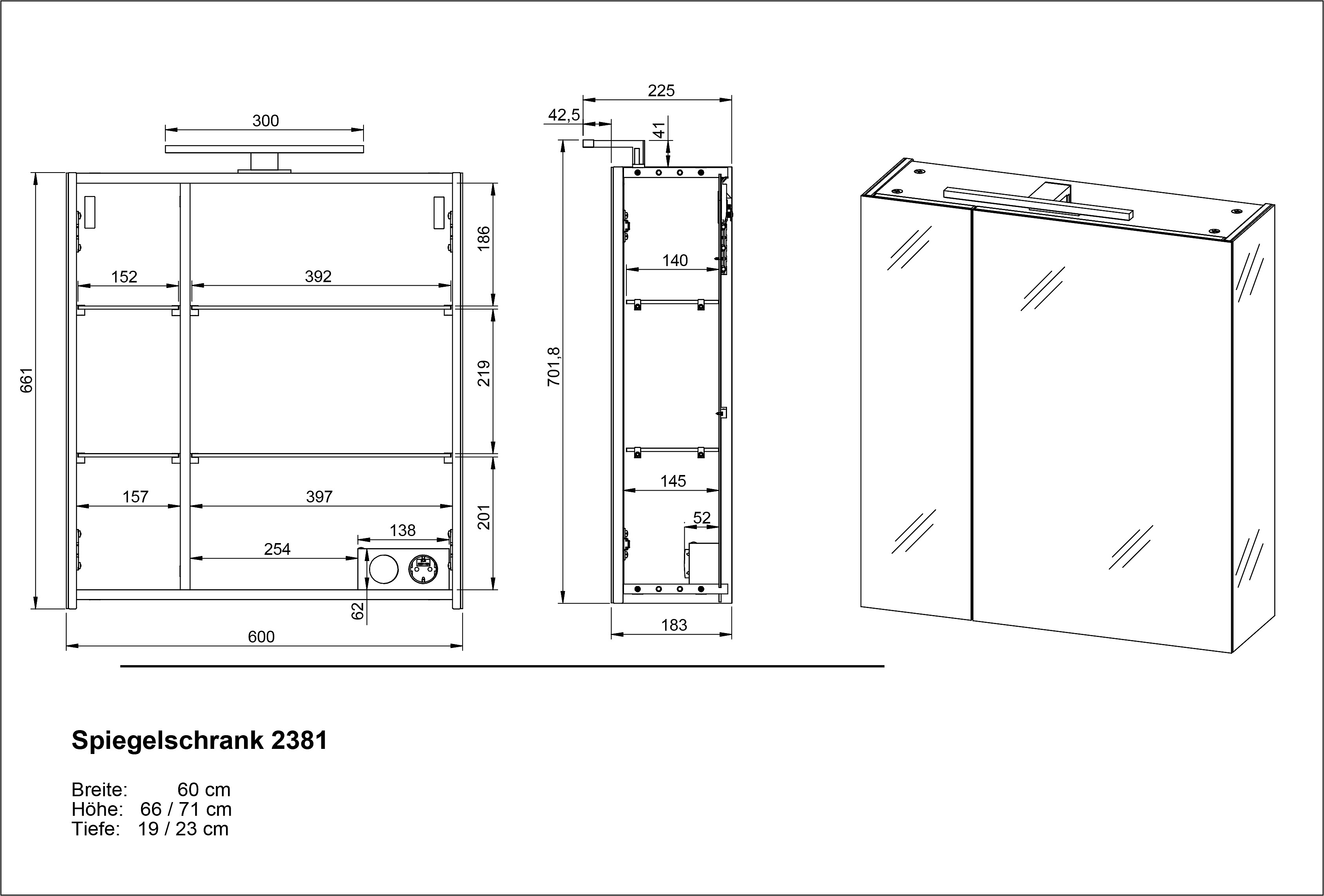 Zidni/s ogledalom/s rasvjetom, od iverice, završna obrada: Melamin, sivi, širina 60 cm, visina 71 cm, dubina 23 cm
