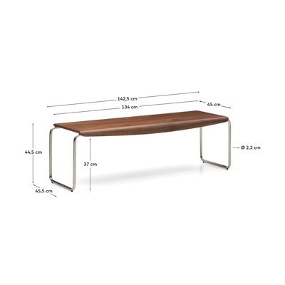 Klupa Tarsel brenda Kave Home elegantan je i praktičan dodatak vašem interijeru. Njezina gornja ploča izrađena je od savijenog drva s furnirom oraha debljine 0,6 mm, koji je obrađen membranskom prešom i poliuretanskim lakom za povećanu otpornost i trajnost. Klupa je izrađena od cjevastog nehrđajućeg čelika s efektom brušenja koji pomaže u smanjenju vidljivosti otisaka prstiju. Za stabilnost na neravnim podovima, klupa je opremljena podesivim nogama na podnožju.