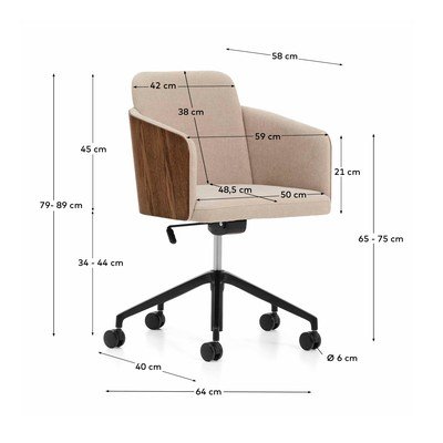Uredska stolica Madai brenda Kave Home dizajnirana je za udobnost i funkcionalnost. Sjedalo i naslon presvučeni su šenilom, dok je vanjska strana naslona izrađena od jasenovog furnira. Stolica je opremljena okretnim sjedalom čija se visina može podesiti do 10 cm. Naslon nudi mogućnost naginjanja u rasponu od 0 do +12,5º s funkcijom fiksiranja odabranog položaja. Baza i noge izrađene su od aluminija s mat završnom obradom i termoreaktivnim lakom otpornim na ogrebotine. Poliuretanski kotači nježni su prema podu i štite ga od ogrebotina. Uključen je i sustav prigušenja koji pomaže u kontroli kretanja stolice tijekom upotrebe. Drvo korišteno u stolici ima FSC Mix Credit certifikat, što jamči da dolazi iz odgovorno upravljanih šuma.
