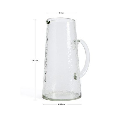 Vrč Obila brenda Kave Home izrađen je od recikliranog stakla. Njegov jednostavan i bezvremenski dizajn lako se prilagođava različitim stilovima i prigodama, dodajući funkcionalnost i karakter vašem iskustvu objedovanja. Karakterizira ga teksturirana površina koja podsjeća na ručni rad. Čvrstoća stakla osigurava svakodnevnu upotrebu, a zahvaljujući mogućnosti pranja u perilici posuđa, njegovo održavanje je vrlo jednostavno. Ovaj svestrani komad dizajniran je da prati svaki obrok i donosi radost u bilo kojem trenutku.