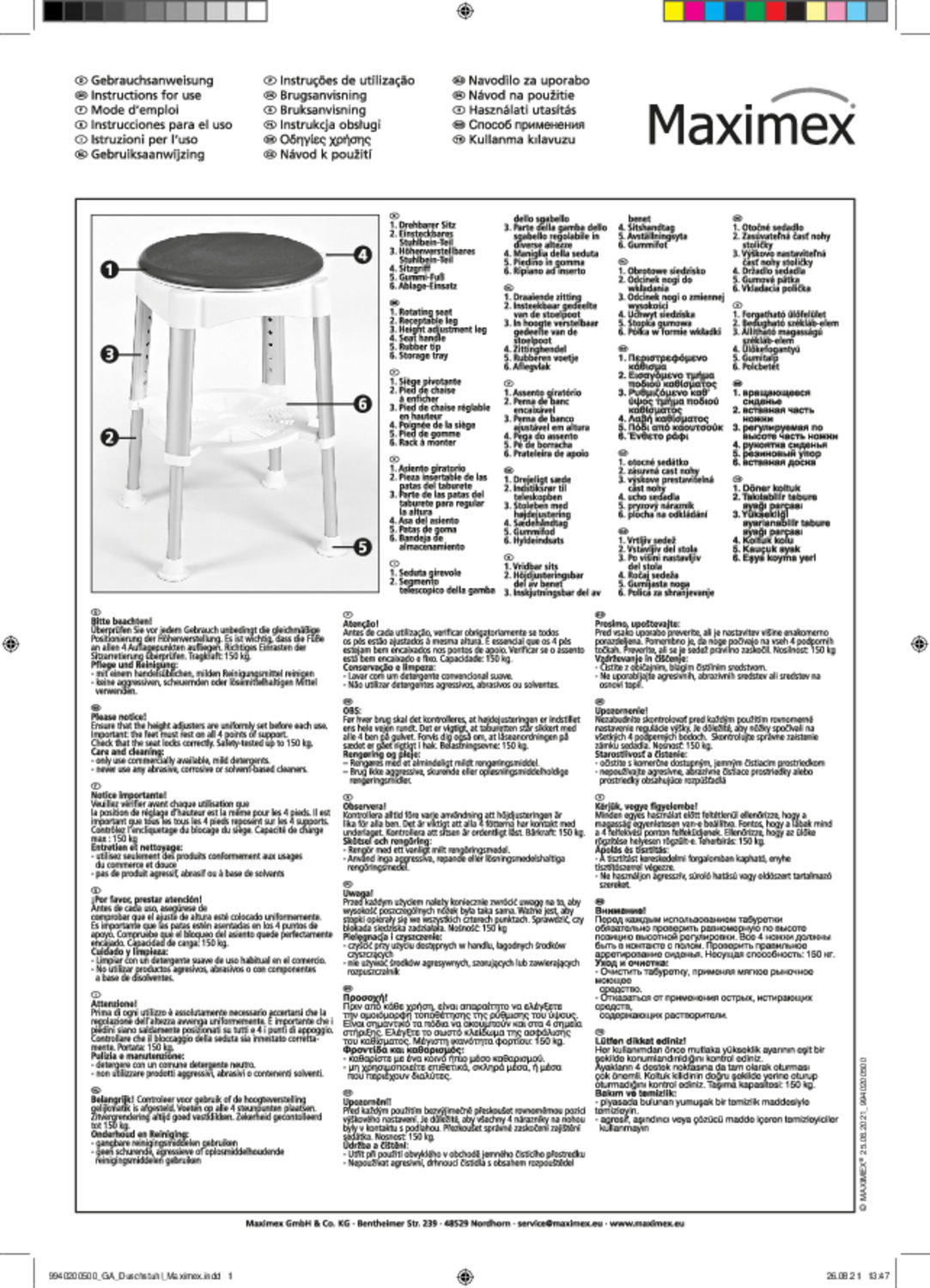 Neklizajuće noge izrađene su od nehrđajućeg čelika kako bi se osigurala potrebna robusnost i stabilnost. Osim toga, njihova se visina može podešavati u 7 različitih razina. Okretno sjedalo promjera 35 cm izrađeno je od poliuretanske pjene koja osigurava željenu udobnost.