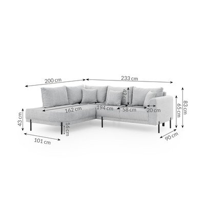 Od šenilaS lijevim kutom/u obliku slova LSvijetlo sivaPogodna za kućne ljubimce/otporna na mrljeS 4 mjestaŠirina 233 cm
