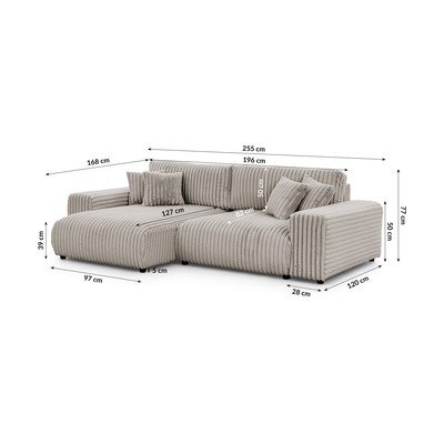 Od samtaSklopiva/s prostorom za odlaganjeS lijevim kutomSvijetlo sivaVodootporna/otporna na mrljeS 3 mjestaŠirina 255 cm
