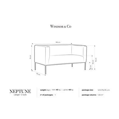 Neptune minimalističke sofe i fotelje iz Windsor & Co. daju interijeru moderan štih svojim jednostavnim, a opet šarmantnim dizajnom. Njihova navlaka od 100% poliestera vrlo je mekana na dodir i lako se čisti. Opremljen je Cleanaboo tehnologijom, zahvaljujući kojoj se tekućine prolivene po površini sofe talože u kapi i ne prodiru kroz presvlaku. Za Vašu savršenu udobnost pobrinut će se punjenje koje se sastoji od poliuretanske pjene visoke gustoće od 30-35 kg/m2. O brendu: francuski brend Windsor & Co. Sofas dizajnira moderne sofe i fotelje za svakodnevni život i estetski užitak. Dizajnerska sofa iz Windsor & Co. Sofe nije samo obična sofa, već sinonim za dom.
