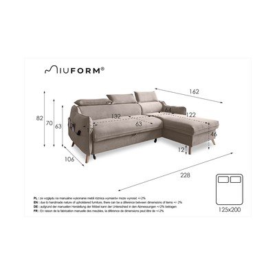BaršunastiPodesiva/sklopiva/s prostorom za odlaganjeS desnim kutom/s ležaljkomVodootporna/pogodna za kućne ljubimceSvjetlo smeđaS 3 mjestaŠirina 228 cmDubina 162 cmDubina sjedala 63 cm