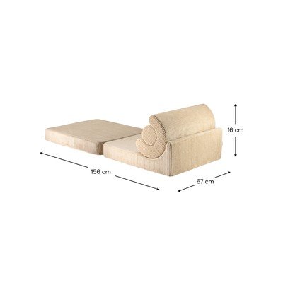 S podesivim naslonom i mekim dizajnom nudi udobnost i fleksibilnost. Stolica je prikladna za djecu od 5 do 11 godina. Kada je rasklopljena, dimenzije su joj 67 x 156 x 16 cm. Navlaka od korduroja se može skinuti i prati u perilici rublja na 30 °C sa sličnim bojama. Zatim je ostavite da se osuši na zraku.