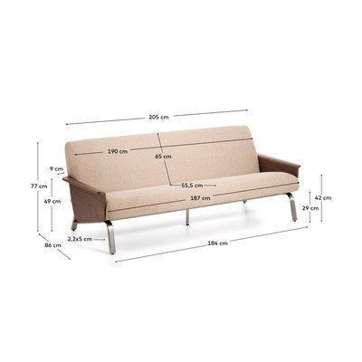 Konstrukcija sofe kombinira izdržljivu 18 mm šperploču prekrivenu hrastovim furnirom s čistim linijama naslona za ruke. Noge od brušenog nehrđajućeg čelika promjera 1,8 mm daju cijelom dizajnu moderan i stabilan dodir. Sjedalo nudi srednju čvrstoću idealnu za svakodnevnu upotrebu, zahvaljujući promišljenoj kombinaciji traka, opruga i slojeva pjene visoke gustoće (35 kg/m³ i 40 kg/m³), što osigurava čvrstoću, izdržljivost i izvrsnu udobnost.