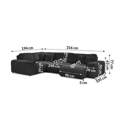 Od samta, s lijevim kutom/u obliku slova "U", tamno siva, vodootporna/otporna na mrlje, s 4 mjesta, širina 316 cm
