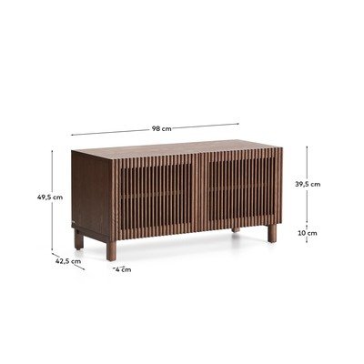 Ormarić za cipele Beyla brenda Kave Home kombinira pažljivo osmišljen dizajn s esencijom jasenovog drva. Njegova konstrukcija izrađena je od jasenovog furnira, dok su vrata i noge izrađeni od masivnog drva. Vrata su ukrašena okomitim letvicama koje stvaraju zanimljiv vizualni efekt i omogućuju svjetlosti da se igra sa suptilnim kontrastima na površini. Za tihu i udobnu upotrebu, vrata su opremljena šarkama s mekim zatvaranjem. Tu su i podesive nožice koje pomažu u izravnavanju neravnina na podu.