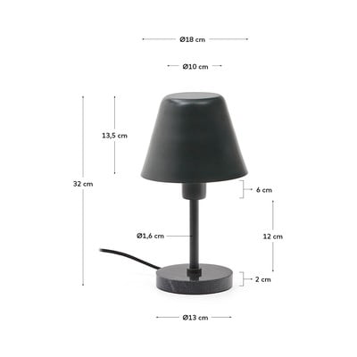 Stolna lampa Calina brenda Kave Home izrađena je od tamnozelenog metala s crnom mramornom bazom. Svjetiljka je kompatibilna s E27 žaruljom maksimalne snage 25 W. Žarulja nije uključena.