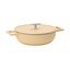 Emajlirani premaz ispunjava neravnine površine od lijevanog željeza, povećava svojstva neprianjanja i istovremeno štiti proizvod od korozije. Nakon kuhanja, hranu možete odmah poslužiti u njemu, jer emajlirano lijevano željezo dugo zadržava temperaturu. Posuđe je prikladno za sve vrste štednjaka, uključujući indukciju, pećnicu i roštilj, do temperature od 260 °C. Međutim, nije namijenjeno za korištenje na otvorenoj vatri.