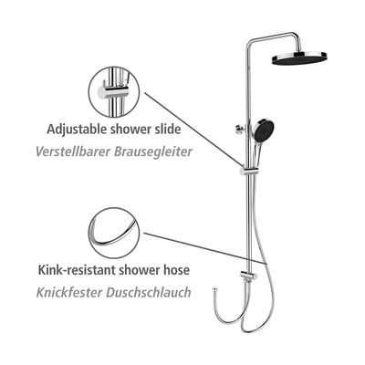 Wenko set za tuširanje sastoji se od glave kišnog tuša (Ø 26) i glave ručnog tuša (Ø 13 cm), koje se lako mijenjaju pomoću mjedene tipke. Kišna glava opremljena je s ukupno 416 integriranih mlaznica koje nježno prskaju vodu po koži. Ručna glava tuša s 324 mlaznice nudi ukupno 3 funkcije vodenog mlaza - kišu, masažu i intenzivne postavke. Nadopunjuje ga crijevo dugo 150 cm koje je otporno na uvijanje i savijanje.