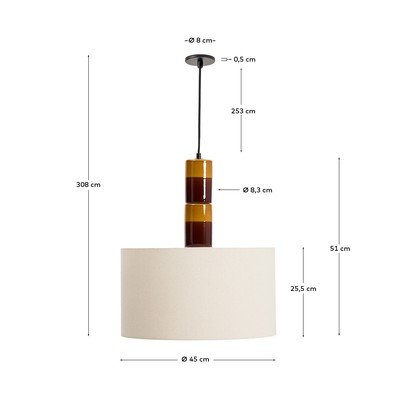Viseća lampa Mavran brenda Kave Home impresionira svojim jedinstvenim dizajnom. Njezino podnožje izrađeno je od glazirane keramike s prugama koje cjelini dodaju dinamiku i osobnost. Tanak, vertikalni oblik lampe izgleda elegantno, a pamučno sjenilo osigurava ugodno filtriranje svjetlosti. To stvara meku i obavijajuću atmosferu, idealnu za dnevne sobe, spavaće sobe ili kutke za čitanje. Kabel je prekriven ekstra mekom tkaninom, što dodaje profinjenost i ugodan dodir. Svjetiljka je kompatibilna s E27 žaruljama maksimalne snage 40 W. Žarulja nije uključena.