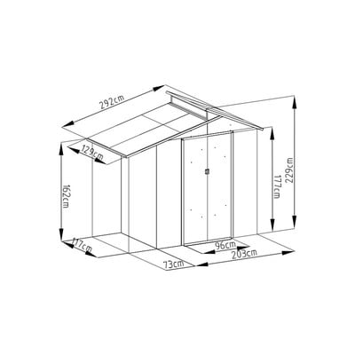 Dvostruka klizna vrata dimenzija 96 x 177 cm omogućuju jednostavan pristup pohranjenim predmetima. Kuća je izrađena od visokokvalitetnog vruće pocinčanog čeličnog lima debljine 0,25 - 0,30 mm s ventilacijskim rešetkama. Ploče su pričvršćene pomoću okvira od pocinčanog čelika debljine 0,5 - 0,8 mm i perimetarskog okvira, koji se moraju pričvrstiti na ravnu podlogu (beton, pločice, drveni pod, itd.) pomoću priloženih sidrenih vijaka .