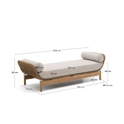 Sofa Catalinabrenda Kave Home stilski je dodatak vašem interijeru i eksterijeru. Izrađena je od masivnog bagremovog drva, koje dolazi iz 100% FSC certificiranih izvora, što jamči odgovorno gospodarenje šumama. Njezina konstrukcija nadopunjena je ručno tkanim poliesterskim užetom, što joj daje elegantan izgled. Ova sofa otporna je na UV zračenje, što je čini savršenom za vrt, terasu ili bazen. Uključuje udobne jastuke s uklonjivim navlakama za jednostavno održavanje. Zahvaljujući svom dizajnu s cilindričnim naslonima za ruke na krajevima, pruža ugodno mjesto za opuštanje.
