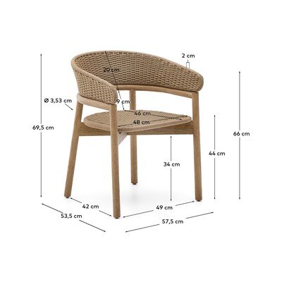 Stolica Arinellabrenda Kave Home izrađena je od masivnog bagremovog drva s prirodnom završnom obradom. Svaki komad ima svoje jedinstvene tonove i drvene godove, što mu daje prepoznatljiv karakter. Sjedalo i naslon izrađeni su od ručno tkanog užeta, otpornog na UV zračenje. Zbog toga je stolica prikladna za unutarnju i vanjsku upotrebu. Drvo korišteno za izradu ove stolice ima FSC 100%™ certifikat, što jamči odgovorno gospodarenje šumama. Kako bi se održao savršen izgled, preporučuje se nanošenje proizvoda za održavanje bagremovog drva barem jednom godišnje.
