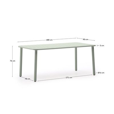Blagovaonski stol Brai brenda Kave Home odličan je izbor za vaš vrt, terasu ili čak unutarnji prostor. Njegova pravokutna ploča sa zaobljenim kutovima ima uzorak letvica koji mu daje moderan izgled. Izrađen je od pocinčanog čelika, što osigurava visoku otpornost na abraziju i koroziju, čineći ga izdržljivijim od običnog čelika. Zbog toga je stol spreman za teške vanjske uvjete. Noge stola također su opremljene podesivim plastičnim zaštitnicima koji sprječavaju oštećenja ili ogrebotine na podu.