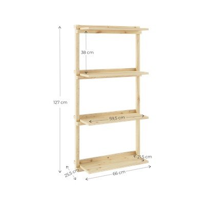 Polica je izrađena od kvalitetne borovine u prirodnoj boji, što joj daje elegantan i bezvremenski izgled. Njegove dimenzije od 66 x 127 cm omogućuju učinkovito korištenje zidnog prostora.