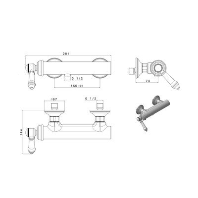 Ova zidna slavina za tuš u mesinganom dizajnu ima upravljanje polugom. Budući da se isporučuje bez pribora, potrebno je kupiti ručni tuš i crijevo za tuš. Razmak dovoda vode je 150 mm.